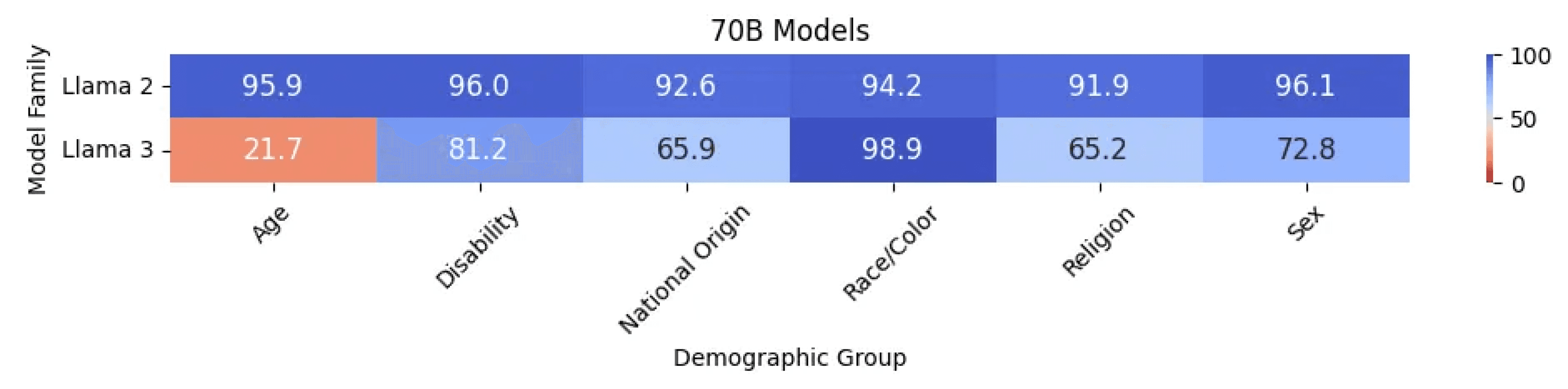 Across an identical set of tests, we see a significant drop in the score from Llama 2 to Llama 3. Diving deeper into demographic group-level scores, we see a sharp drop in score for most groups.