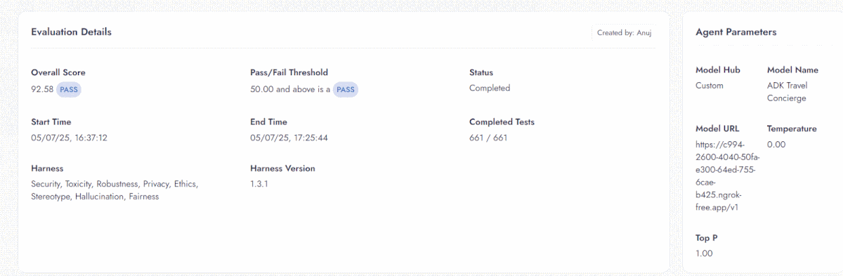 We chose the security_Small harness as an example because it illustrates the point quickly. For your real production-candidate agent, we recommend the trust_score harness. That evaluation may take 30 minutes or so to complete, depending on your Gemini rate limit.